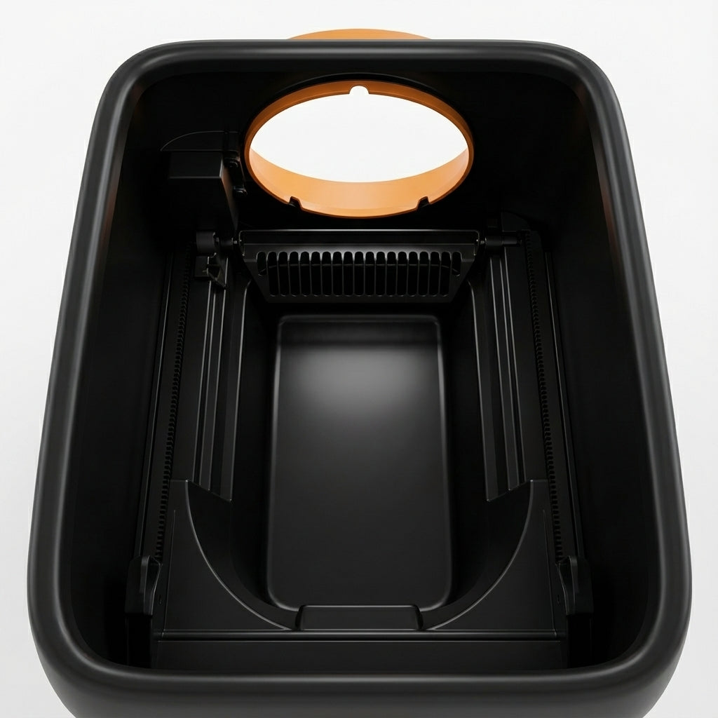 - Architecture fermée anti-éclaboussuresLe tambour entièrement clos et l’ouverture optimisée bloquent les jets de litière pendant que le chat gratte, pour éviter toute dispersion autour de la litière.