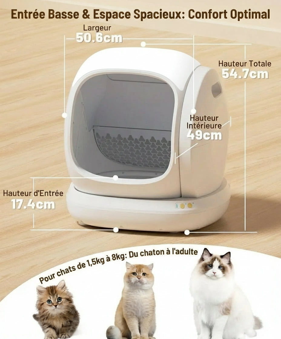 - Capacité du bac à déchets : 9 litres — Plusieurs jours d'autonomie pour un chat.