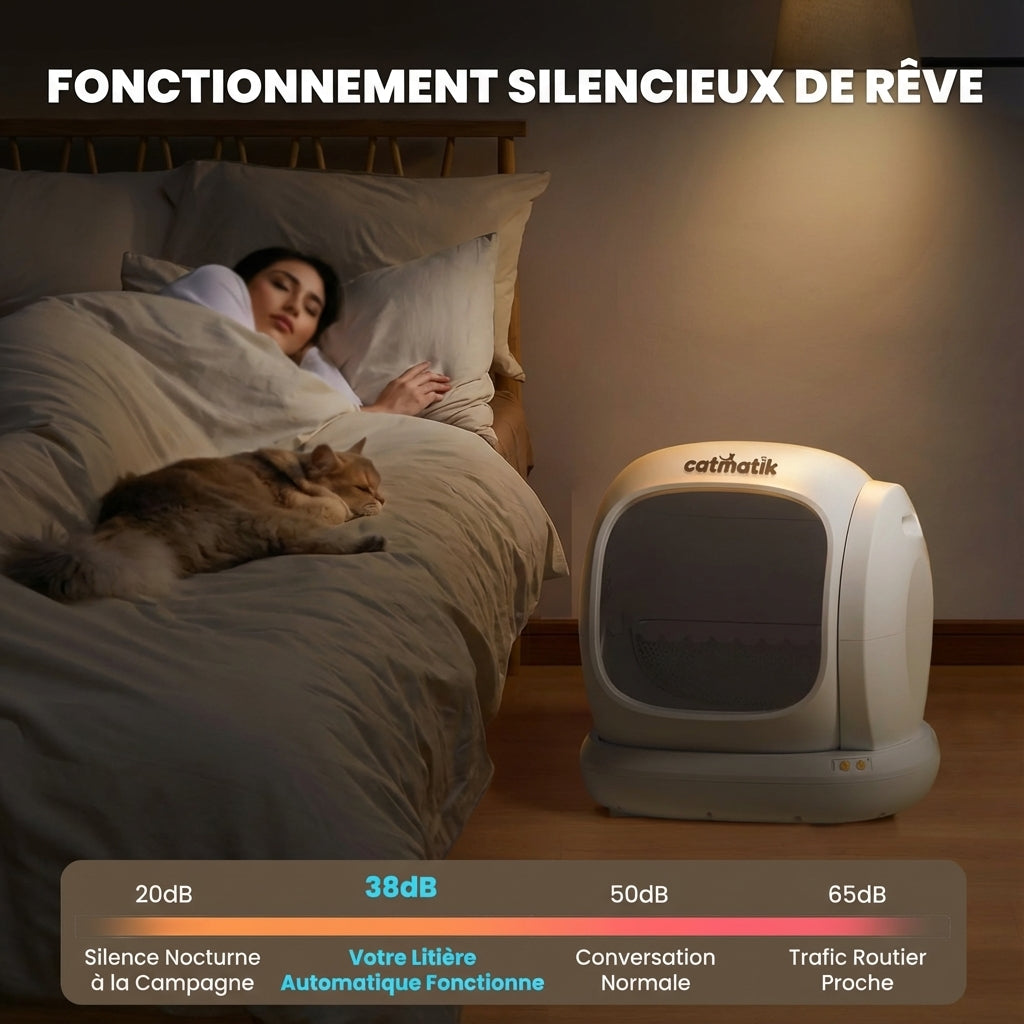 - Aucun réveil nocturnePlacez la litière dans une chambre ou un petit appartement sans craindre les démarrages bruyants en pleine nuit.