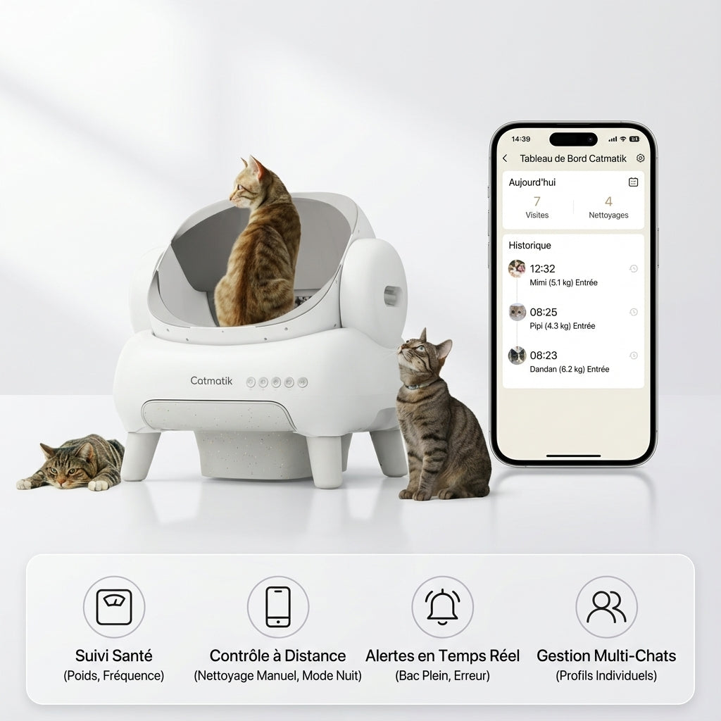 Connectée en WiFi 2.4 GHz, la litière communique avec l'application Neakasa disponible sur iOS et Android. Consultez l'historique des passages, surveillez le poids de votre chat à chaque visite, programmez les cycles de nettoyage et recevez une notification quand le bac à déchets doit être vidé. Un outil précieux pour détecter rapidement tout changement de comportement ou de poids pouvant signaler un problème de santé.